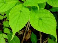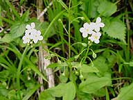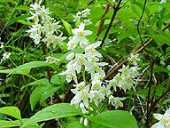 ちなみに、ぼくらが脱落するまでにガイドさんから説明してもらった植物は、枝の内部が空洞なのでウツギ(空木)という名の付いたタニウツギ、同じくヒメウツギ、食用にする胡桃で長い花穂を垂れているオニグルミ、渓流沿いの斜面で水平に張った枝一面に白い花を咲かせているミズキ、白い小さな花を円錐形に積み上げたように咲いている実がとち餅の材料となるトチノキ、山地に咲く可憐なランの仲間ノビネチドリ、葉の真ん中に緑色の小さな花が咲くハナイカダ(写真は雄花)、穂が狸の尻尾に似ているというので名前が付いたタヌキラン、こいのぼりの矢車に似た大きな葉のヤグルマソウ、雉の筵の意味だという黄色い花のキジムシロ、美しい白い花序を静御前にたとえたヒトリシズカ、小型のシャガで薄紫の花が美しいヒメシャガ、淡い紫色の花は比較的地味なニシキゴロモ、ちいさめの白い花が二つ並んで咲くニリンソウ、背が高い大型のスミレで薄紫の花がきれいなオオタチツボスミレ、草餅にするとヨモギよりおいしいというオオヨモギなどでした。(ガイドさんがこのように説明したということではありません。)